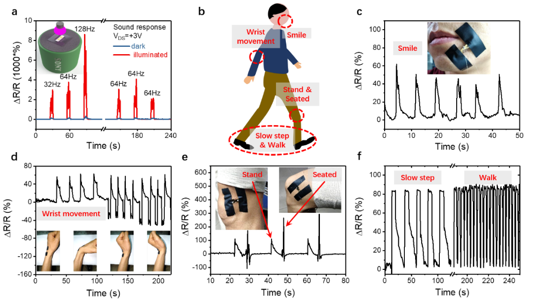 In recent years, software robots, remote monitoring, artificial intelligence, and wearable medical instruments have developed rapidly, and there are higher requirements for the flexibility, sensitivity, and low power consumption of the corresponding sensor. Currently, commercial strain sensors are mainly based on metal materials. However, metal has no energy gap, so the gauge factor of a metal strain sensor is generally limited to a small range of 1-5. Although the energy gap strain of traditional semiconductors is adjustable, traditional semiconductor materials are usually very brittle, which also limits the strain detection range of wearable devices. Compared with metal materials and traditional semiconductor materials, Van der Waals layered semiconductor materials have excellent flexibility, optoelectronic properties and piezoelectric properties, and have huge application prospects in energy storage, optoelectronics, sensing, and wearable devices. Based on this, this cross-international and cross-field team proposed a flexible strain sensor based on Van der Waals layered semiconductor materials. Through the mutual interaction of the piezoelectric effect and the photoelectric effect to adjust the concentration and mobility of carriers, it is the first time that the gauge factor can be continuously adjusted in the range of 23-3933. In addition, as shown in the figure below, the Van der Waals flexible sensor can detect tiny vibrations caused by sound and monitor daily human activities, fully demonstrating its potential applications in robotics, remote monitoring, artificial intelligence, and wearable medical care. prospect.