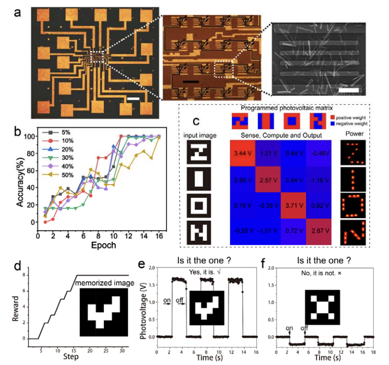 Based on this novel ferroelectric effect, researchers have WS2 nanotube’s polarization tuned by external voltage/current. With the appropriate forbidden bandgap, the WS2 nanotubes generate ferroelectric hysteresis of photovoltaic response in the visible light range (as shown in Fig. 1). The mesoscopic slip ferroelectric effect of WS2 nanotubes makes its photovoltaic response programmable and non-volatile photovoltaic characteristics, so it is a natural and ideal photovoltaic random-access memory (photovoltaic random-access memory, PV-RAM). The research team further took advantage of this feature to prepare a 16-pixel PV-RAM array, and used the photoresponsivity (i.e., the ratio of output photocurrent to input optical power) of each PV-RAM structural unit in the array as a synapse in the neural network. The weight is adjusted by external voltage/current excitation, which realizes the embedding of the neural network algorithm at the hardware level, and successfully demonstrates the image recognition function with the supervised learning and reinforcement learning algorithms (as shown in Figure 2). This is the first time that the four functions of sensing, computing, storage, and driving have been integrated into a hardware system based on smart materials, which has important reference significance for building future high-speed, low-power, and even self-driven intelligent IoT platforms.