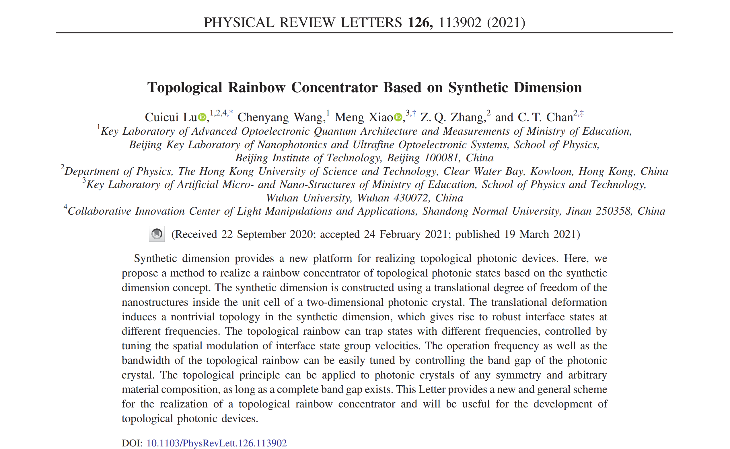 Prof. Cuicui Lu is the first and co-corresponding author, Prof. Meng Xiao and Prof. C. T. Chan are also corresponding authors. This work was mainly supported by the National Natural Science Foundation of China, Beijing Institute of Technology Research Fund Program for Young Scholars, and Hong Kong Research Grants Council.