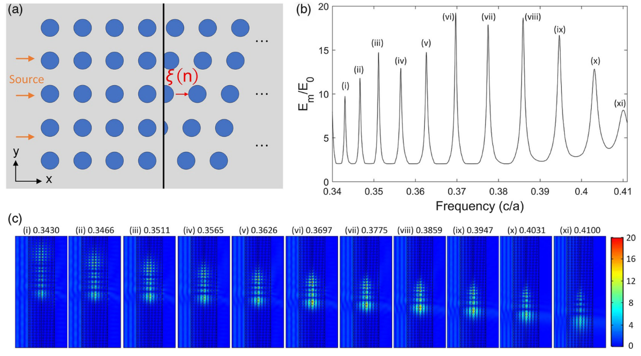 Fig. 1 (a) The schematic diagram of the structure excited by plane wave along the x direction. (b) The spectrum of enhancement rate of the maximal intensity over the incident plane wave Em=E0. (c) The electric intensity distribution of the peaks in (b).