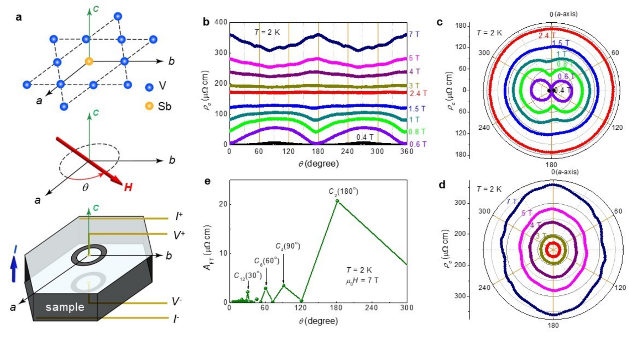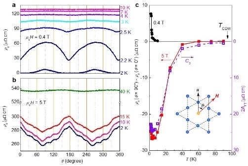 The mechanism of CDW in CsV3Sb5 materials and especially the relationship with superconductivity have always been the focus of attention. The CDW in CsV3Sb5 was extensively studied by infrared spectroscopy. It is found that above TCDW = 91 K, the low-frequency photoconductivity of the material exhibits a clear Drude response, which is consistent with the metallicity of the material. Typical optical signatures of charge density waves are observed below the TCDW. Further by performing Drude-Lorentz fitting on the photoconductivity spectra at all temperatures, as shown in Fig. 4. It is found that the CDW energy gap opens at the saddle point of the M point, while neither the electron band near the Γ point nor the Dirac band near the K point is affected. This result suggests that the nesting of the saddle point at M point through the wave vector Q may be the driving mechanism of the charge density wave in CsV3Sb5. This work was published in PRB [Phys. Rev. B 104, L041101 (2021)] as a letter and was selected as an Editors’ Suggestion. They then measured the resistivity of CsV3Sb5 in the c-axis (as shown in Fig 5), where the current is along the c-axis and is always perpendicular to the magnetic field, which is parallel to the ab plane and rotates within the plane. It can be seen that the resistivity versus angle under various magnetic field has obvious two-fold symmetry, which destroys the in-plane six-fold (or triple) symmetry of the crystal structure. When the applied magnetic field is less than 2.4 T (corresponding to the superconducting state) and larger than 2.4 T (corresponding to the normal state), the magnetic field directions corresponding to the minimum resistivity values are perpendicular to each other, indicating that the superconducting state and the normal state have two-fold symmetry perpendicular to each other. The relationship of these two kinds of two-fold symmetries with temperature was further investigated, and the results are shown in Fig. 6. It can be seen that the two-fold symmetry resistance corresponding to the superconducting state at low magnetic field disappears rapidly around the superconducting transition temperature, while the one measured in the normal state at high magnetic field weakens as the temperature increases, and transitions at the CDW. These results greatly enrich the understanding of this Kagome superconducting material and its physical properties. The results were published in Nature Communications [Nat. Commun. 12, 6727 (2021)].