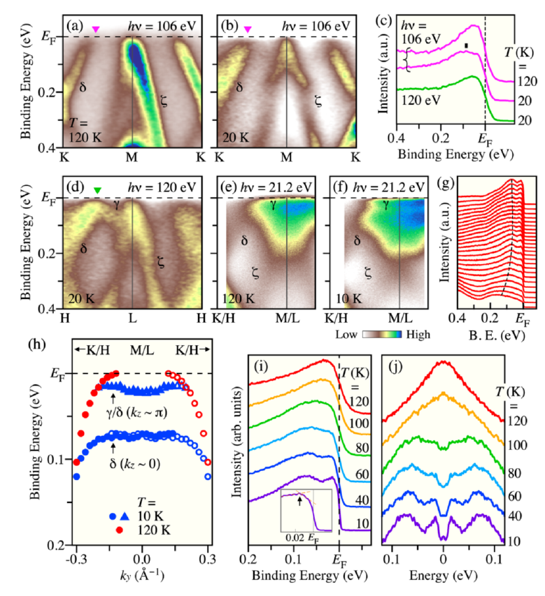 The saddle point and Dirac point were first observed in the CsV3Sb5 parent material, as shown in Fig. 7. With the temperature decreased below the CDW transition temperature, a CDW energy gap was observed, and the energy gap has strong Fermi-surface and momentum-dependent, as shown in Fig. 8. The results were published in PRB as a Letter [Phys. Rev. B 104, L161112 (2021)]. Moreover, by in-situ Cs deposition on the surface of CsV3Sb5, the system was electron doped for the first time, and thus the CDW and the energy band of the system were manipulated. The electron doping by Cs deposition exhibits orbital selectivity, characterized by a significant increase in electron filling in the Sb 5pz and V 3dxz/yz bands, while the V 3dxy/x2−y2 band is relatively stable. By studying the variation of the CDW energy gap around the M point with temperature, it is found that the Cs modification can completely suppress the CDW while keeping the saddle point at the Fermi level, as shown in Fig 9. This result suggests that the multiorbital effect plays a crucial role in the formation of CDW. And at the same time, due to the competition between CDW and superconductivity, it provides a possibility to manipulate CDW and superconductivity in the AV3Sb5 system in the future. Theses results were published in PRX [Phys. Rev. X 12, 011001 (2022)].