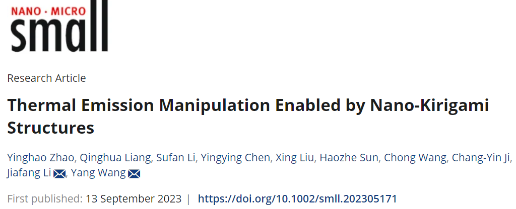 近日,44118太阳成城集团汪洋研究员、李家方教授团队在动态热辐射超表面研究方面取得重要进展,该工作基于纳米剪纸结构通过多物理场调控的方式实现了红外热辐射的强度和峰值波长的原位调控,并探索了它在动态热管理、能源转换方面的应用潜力。相关研究成果以“Thermal Emission Manipulation Enabled by Nano-Kirigami Structures”为题发表在Small期刊[Small, 2305171 (2023)]上。该研究工作得到了国家自然科学基金委、国家重点研发计划和北京市自然科学基金的资助。