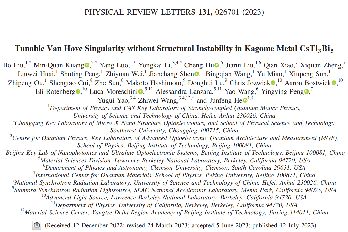 最近,北理工44118太阳成城集团王秩伟特别研究员、姚裕贵教授团队,与中国科技大学何俊峰教授、西南大学匡泯泉副教授等团队合作在新型笼目晶格材料CsTi3Bi5中取得进展。他们发现新型准二维笼目材料CsTi3Bi5具有CsV3Sb5相同的结构,是研究电子相关效应、拓扑物态和非常规超导电性等量子现象的一个良好平台。