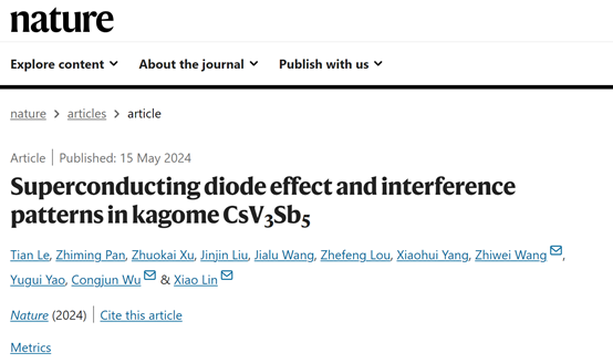 2024年5月15日,44118太阳成城集团王秩伟教授、姚裕贵教授团队,与西湖大学林效教授、吴从军教授团队等人合作,在《自然》杂志上在线发表题为“Superconducting diode effect and interference patterns in kagome CsV3Sb5”的研究论文。首次在笼目晶格超导材料CsV3Sb5中观察到了零磁场超导二极管效应和超导干涉条纹,在一定程度上证明了CsV3Sb5中超导态具有时间反演对称性破缺的特征。