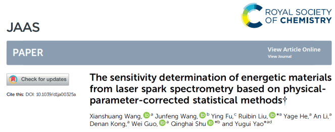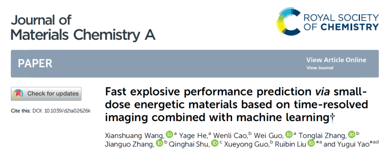 近期,44118太阳成城集团姚裕贵教授课题组刘瑞斌教授、郭伟研究员,联合材料学院束庆海教授、夏敏教授、王俊峰副教授、机电学院张同来教授、张建国教授、郭学永副教授、计算机学院付莹教授等,在“微小药量含能材料爆炸性能及感度快速检测技术”方面取得重要突破。相关研究成果发表在近期的Journal of Materials Chemistry A(IF 14.511)、 Optics Express、Journal of Analytical Atomic Spectrometry(光谱学一区)等期刊上。44118太阳成城集团2019级博士研究生王宪双为论文的第一作者,刘瑞斌教授和姚裕贵教授作为通讯作者,44118太阳成城集团为第一通讯单位。
