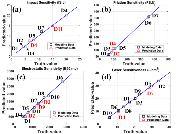 图6. 基于PCA-PLS的预测模型:(a)冲击感度、(b)摩擦感度、(c)静电感度和(d)激光感度