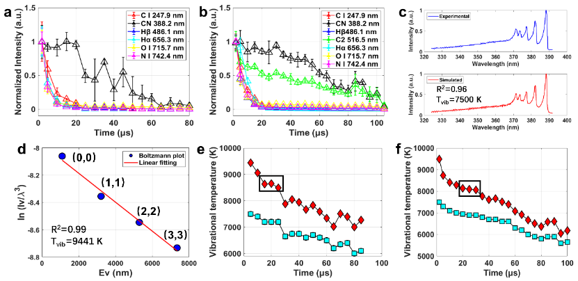 图3. 时间分辨光谱结果:(a)传统高能含能材料光谱强度随时间演化;(b)唑类含能材料光谱强度随时间演化;(c)分子峰实验测试与模拟图对比;(d)玻尔兹曼平面图;(e)传统高能含能材料振动温度随时间演化;(f)唑类含能材料振动温度随时间演化