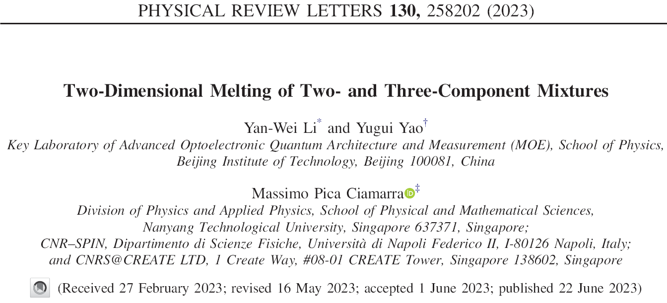 近日,44118太阳成城集团李艳伟研究员、姚裕贵教授同新加坡南洋理工大学数学44118太阳成城集团Massimo Pica Ciamarra教授合作,在二维熔化研究中取得重要进展,相关结果发表在物理学顶尖期刊Physical Review Letters上。