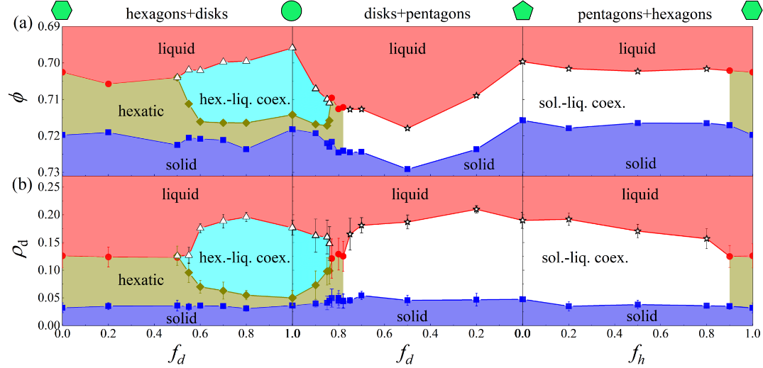三维体系中,晶体-液体转变通常是一级相变且不存在中间相态,而二维晶体到液体的转变更为复杂有趣。根据KTHNY理论,二维体系中,介于晶体与液体之间可能存在中间六角相;近期研究表明,虽然晶体到六角相的转变为连续相变,但是六角相到液体的转变既可能是连续相变,也可能是一级相变。熔化过程中还伴随体系缺陷的演化,如晶体中的位错(dislocation)往往是成对出现的;六角相中则出现成对的位错解离为孤立的位错;液体中孤立的位错可进一步解离为向错(disclination)。到目前,共发现三种不同的二维熔化机理,即不存在中间相的晶体-液体一级相变机理;KTHNY理论预测的两个接连发生的晶体-六角相及六角相-液体连续相变机理;晶体-六角相连续相变、六角相-液体一级相变的混合机理。许多因素可影响二维熔化机理,如粒子形状。研究发现具有硬相互作用的单组分正六边形体系遵循连续相变机理,圆形体系遵循混合机理,而正五边形体系遵循一级相变机理。