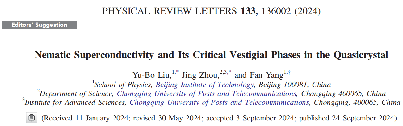 该论文发表在国际顶尖期刊Phys. Rev. Lett. 133,136002(2024),并被编辑特别推荐为“PRL Editor’s suggestion”,在PRL主页上展示。在该期刊发表的论文当中,只有数量占比为1/6的少数特别重要、特具创新性的论文能获此编辑推荐。杨帆教授指导的博士生刘玉波和重庆邮电大学周晶讲师为论文共同第一作者,杨帆教授为论文唯一通讯作者。