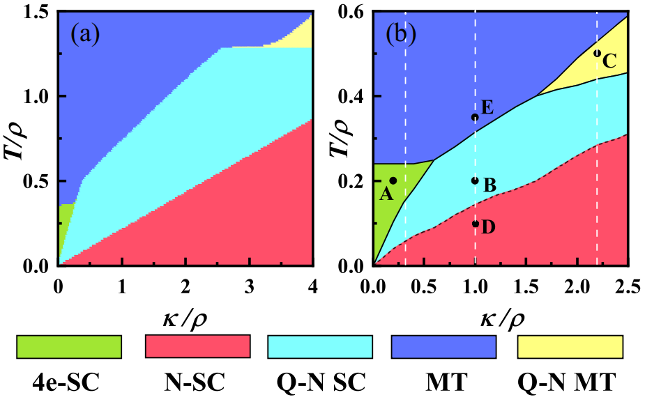 图2:向列序超导的相图。其中(a)为重整化群计算结果;(b)为蒙特卡洛计算结果。不同相由颜色区分。