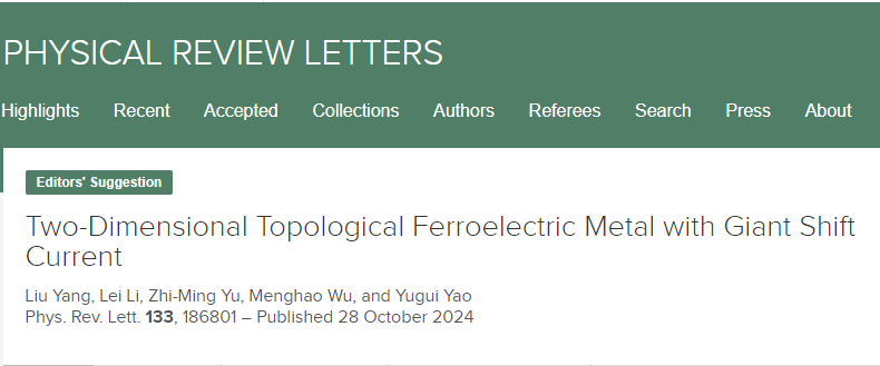 近期,44118太阳成城集团姚裕贵教授团队与华中科技大学吴梦昊教授团队合作,在理论上预言了一种具有空前巨大体光伏效应的本征二维拓扑铁电金属。相关研究成果以题为 “Two-dimensional Topological Ferroelectric Metal with Giant Shift Current” 的论文发表在国际顶级物理学期刊《Physical Review Letters》上,并被该期刊选为 “Editors’ Suggestion”。