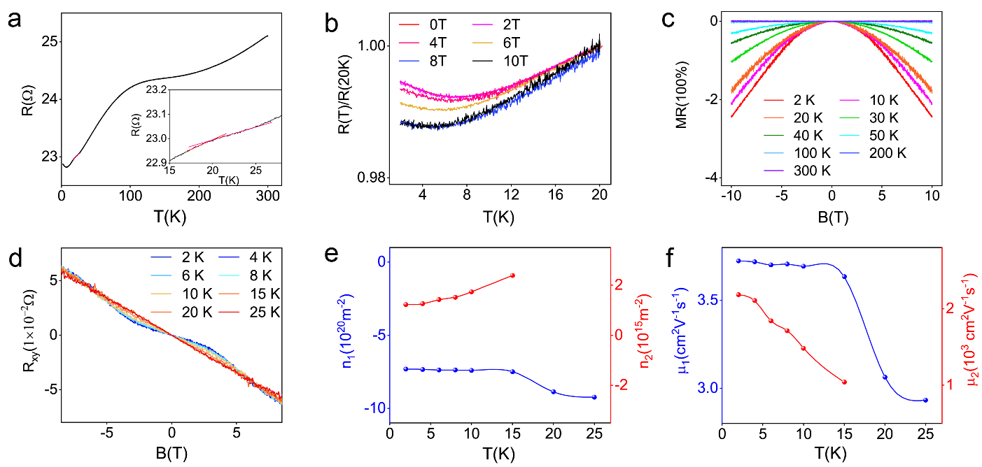 图5. 二维V3S5晶体的电学性质。(a)电阻随温度变化曲线。(b)不同磁场下电阻随温度变化曲线。(c)在不同温度下磁阻变化。(d)不同温度下霍尔电阻Rxy 随磁场的变化。(e,f)载流子密度和迁移率随温度的变化。