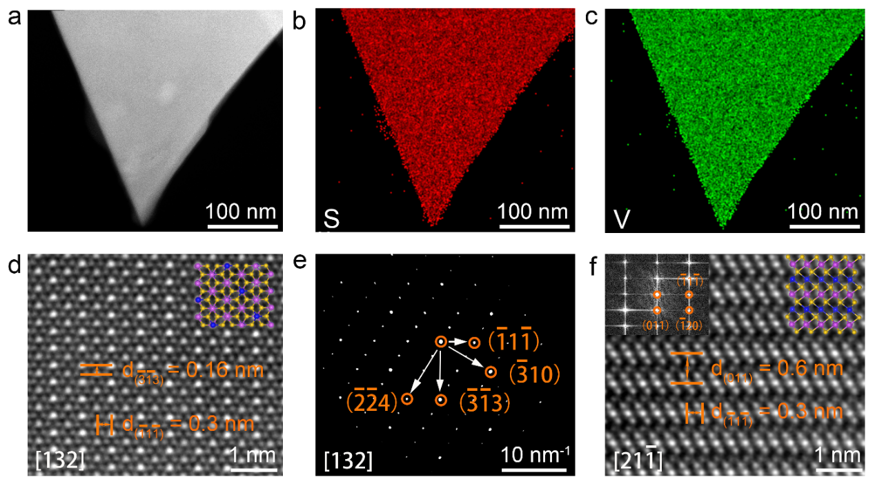 图4. 二维 V3S5的STEM表征。(a)V3S5晶体的TEM图像及S(b)和V(c)元素TEM-EDS mapping。(d)V3S5晶体STEM-HAADF图像。(e)V3S5晶体电子衍射花样。(f)V3S5晶体的截面STEM-HAADF图像。