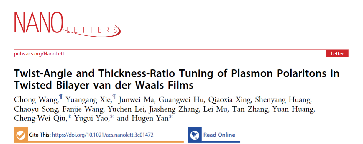 日前,44118太阳成城集团姚裕贵教授、王冲特别研究员,以及复旦大学物理系的晏湖根教授和新加坡国立大学的仇成伟教授合作,共同揭示了操控双层薄膜中的极化激元的光学拓扑性的新机制。相关研究题目为《扭转角度和膜厚比调控双层范德瓦尔兹薄膜中的极化激元》(Twist-Angle and Thickness-Ratio Tuning of Plasmon Polaritons in Twisted Bilayer van der Waals Films),成果被发表在《纳米快报》(Nano Letters)上。