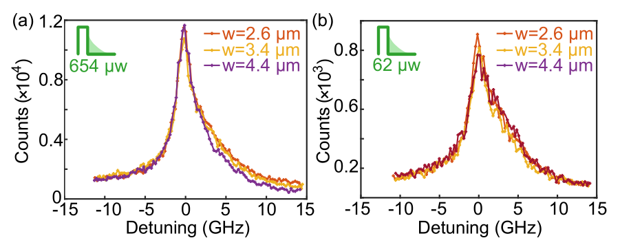 图2. 不同器件的激发态自发发光信号测量。(a)激发功率为 654 µW 时,不同和器件的荧光信号谱。(b)激发功率 62 µW 时,不同器件荧光信号谱。