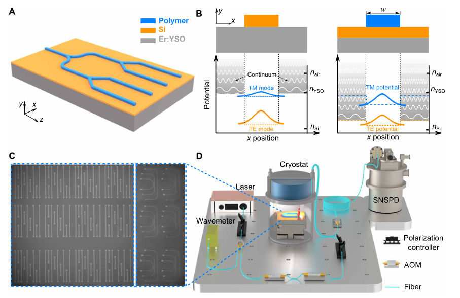 研究者提出了一种新型硅-铒掺杂晶体异质结构(图1A),通过精准调控BIC效应(图1B),实现了光场在芯片上的高效局域与低损耗传输。实验表明,该异质结构在1.5微米通信波段展现出显著优势:光传播损耗低至0.5 dB/cm,较传统非晶硅波导降低约10倍;同时,45%的光场能量穿透至铒掺杂晶体,使铒离子光吸收效率提升20倍以上。利用实验室自主搭建的低温光量子芯片测量系统(图1C和D),实现了片上的光子回波存储,并进一步测量了芯片中铒离子的光学相干时间达2.6微秒,与块体材料性能一致。