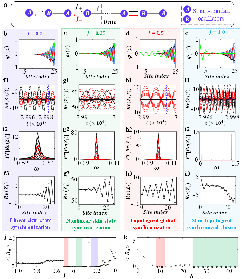 为了进一步分析系统参数对非厄米趋肤全局同步的影响,研究人对Kuramoto序参量进行了扩展,定义了新的序参量Ro来量化系统的同步特性。其中,同相和反相非厄米全局同步态的序参量都具有趋于0。通过计算序参量随非互易耦合强度的变化(图1f)可知,非厄米线性趋肤同步效应只能存在于0.25≤J-≤1.2(J+=1.5)的区间内。这是由非厄米趋肤态的非正交性与弱非线性条件(β|Zl(t)|2≪J+,J-)的平衡所导致的。此外,非厄米趋肤全局同步也可以展示尺寸依赖的临界行为。图1g展示了序参量随系统尺寸N的变化曲线。在N≤7的区域,由于非厄米趋肤态较弱的非正交性,系统展现多频振荡。随着尺寸的增加7<N≤38,非厄米趋肤态的非正交性增强,使得初始激发的所有线性本征态可以相互耦合转化,最终演化到非厄米线性全局趋肤同步态上。然而,当N>38时,系统的弱非线性近似被破坏,非线性本征态主导了系统的动力学特性。当尺寸增大到N>45时,由非线性-非厄米趋肤态统治的全局同步效应出现,即非厄米-非线性全局趋肤同步。上面结果显示,通过增加非厄米-非线性系统的尺寸,可以展现线性或非线性非厄米全局趋肤同步效应,这一反常现象与传统同步模型相反。发生这一现象的本质原因是:线性和非线性趋肤态的非正交性会随着系统尺寸的增大而增强。