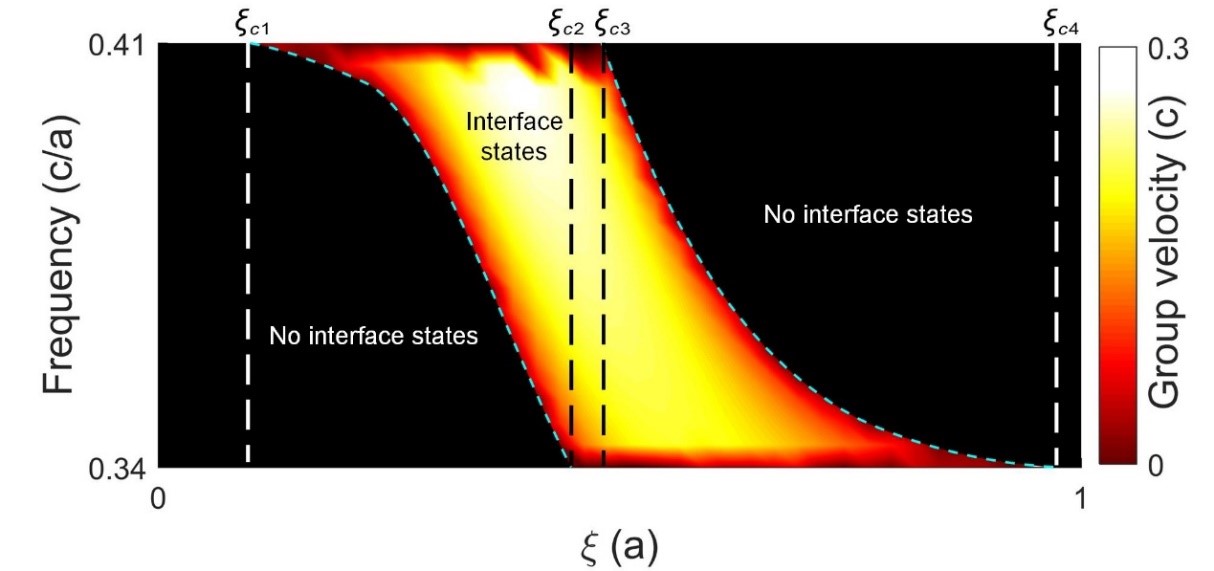 图1 以四方晶格为例构建不同频率拓扑彩虹囚禁。(a)界面左边为完美光子晶体,右侧为引入合成维度的光子晶体,光源放置结构左侧;(b)结构支持的不同频率的拓扑态模式;(c)不同频率入射时囚禁在光子晶体界面处不同位置,频率越大,囚禁位置逐渐向下移动。