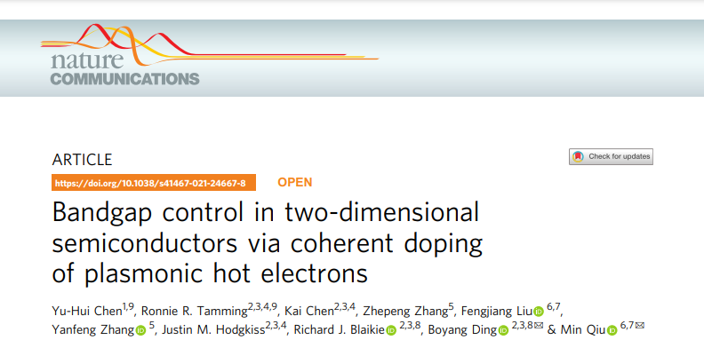 日前,44118太阳成城集团张向东教授课题组青年教师陈宇辉研究员与新西兰维多利亚惠灵顿大学、奥塔哥大学,以及北京大学和西湖大学的研究者开展合作,在表面等离子体光学腔和二维半导体二硫化钨的复合体系上,通过利用光和物质强耦合效应,在实验上实现了对二硫化钨的高效热电子掺杂,大幅改变了二硫化钨原有的带隙,相关研究成果发表在国际顶级期刊《自然·通讯》上。