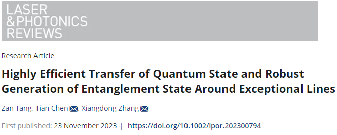 近日,44118太阳成城集团张向东教授课题组设计非厄米量子行走,实现了高效量子态拓扑调控。相关成果以“Highly Efficient Transfer of Quantum State and Robust Generation of Entanglement State Around Exceptional Lines”为题发表在Laser & Photonics Reviews 期刊[Laser Photonics Rev. 2023, 2300794]上。该研究工作得到了国家自然科学基金委的大力支持。44118太阳成城集团汤赞博士、陈天副教授为该论文的共同第一作者,44118太阳成城集团陈天副教授、张向东教授为论文共同通讯作者。