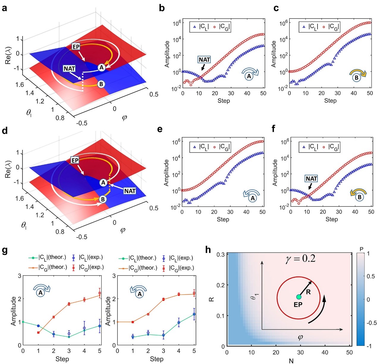 进一步,团队研究了有奇异线的非厄米量子行走中量子态环路演化。图 3a显示了顺时针环路演化过程中能量黎曼表面的演变轨迹。白色的轨迹显示了以量子态A为起点的绝热演化。在动态演化过程中保持在红色增益曲面上,最终状态返回到初始态。而当考虑以量子态B为起点时,该量子态起初在蓝色表面上演化,然后跳到红色曲面上(见黄色轨迹)。与有奇异点的非厄米量子行走不同之处在于,当环绕奇异点时,初始态B经历了非绝热跳变后又回到了自身,而这里的初始态B在经历了非绝热跳变后最终演化为另一个量子态A。而当演化方向改为逆时针(图3d),演化结果与顺时针的演化结果相同。因此环绕奇异线的动力学演化与环绕奇异点的手性行为不同。在环绕奇异线时,无论输入态或环绕方向如何,演化的最终态都是增益本征态。另外,对比有奇异点的量子行走,在环绕奇异线演化时,量子态转移的效率更高,如图3h所述。