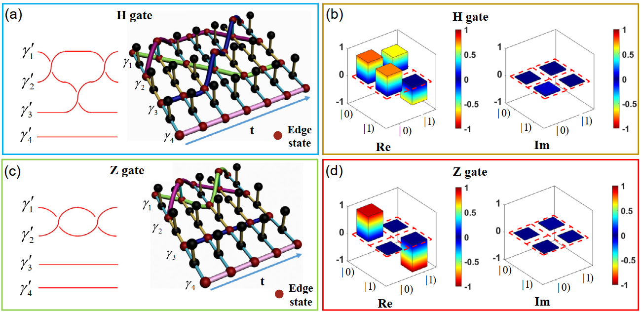 为了演示单比特门对应的编织过程,研究人员激发了4个类马约拉纳零能模式。通过控制前3个零能模之间的顺序编织过程,从而实现了单比特Hadamard门所对应的功能,如图3(a)所示;通过控制前2个模式之间的顺序编织过程,从而实现了单比特泡利z门对应的功能,如图3(c)所示。
