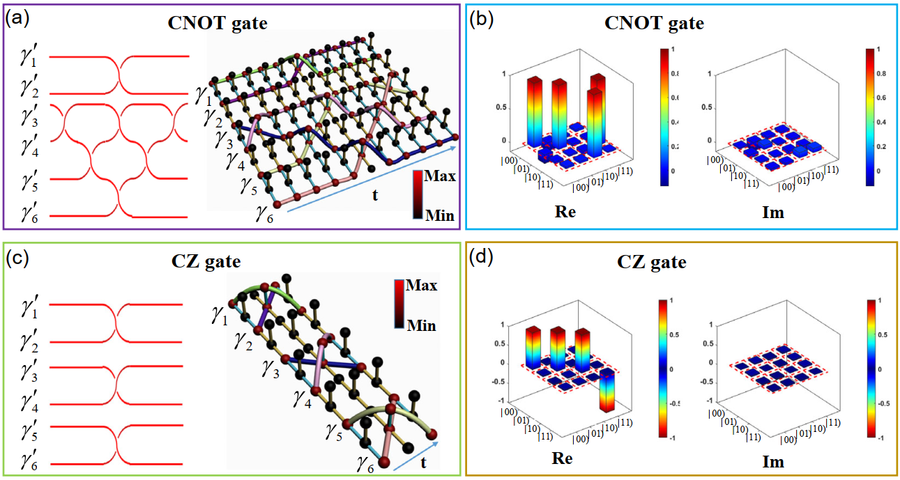 不仅仅是可以通过编织零能模式演示单比特门,还可以演示两比特门的功能。如图4所示。研究人员通过激发6个零能模式来实现两种两比特门。通过控制前2个零能模之间的顺序编织,然后控制后4个零能模式的顺序编织过程,从而实现了两比特控制非门(CNOT门)所对应的功能,如图4(a)所示;通过分别控制每两个模式之间的顺序编织过程,从而实现了两比特控制z门(CZ门)对应的功能,如图4(c)所示。