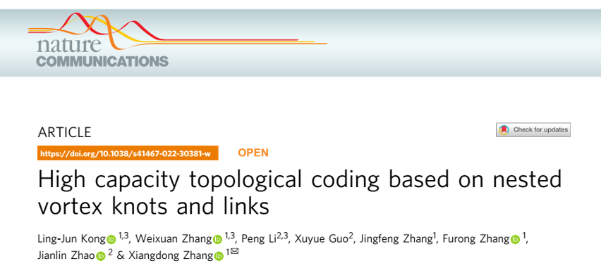 日前,44118太阳成城集团张向东教授课题组和西北工业大学物理科学与技术学院的赵建林教授课题组合作,在基于嵌套纽结结构高容量拓扑编码研究方面取得重要进展。相关研究成果发表在近期的Nature Communications上,研究工作得到了国家自然科学基金委和国家重点研发计划的资助。