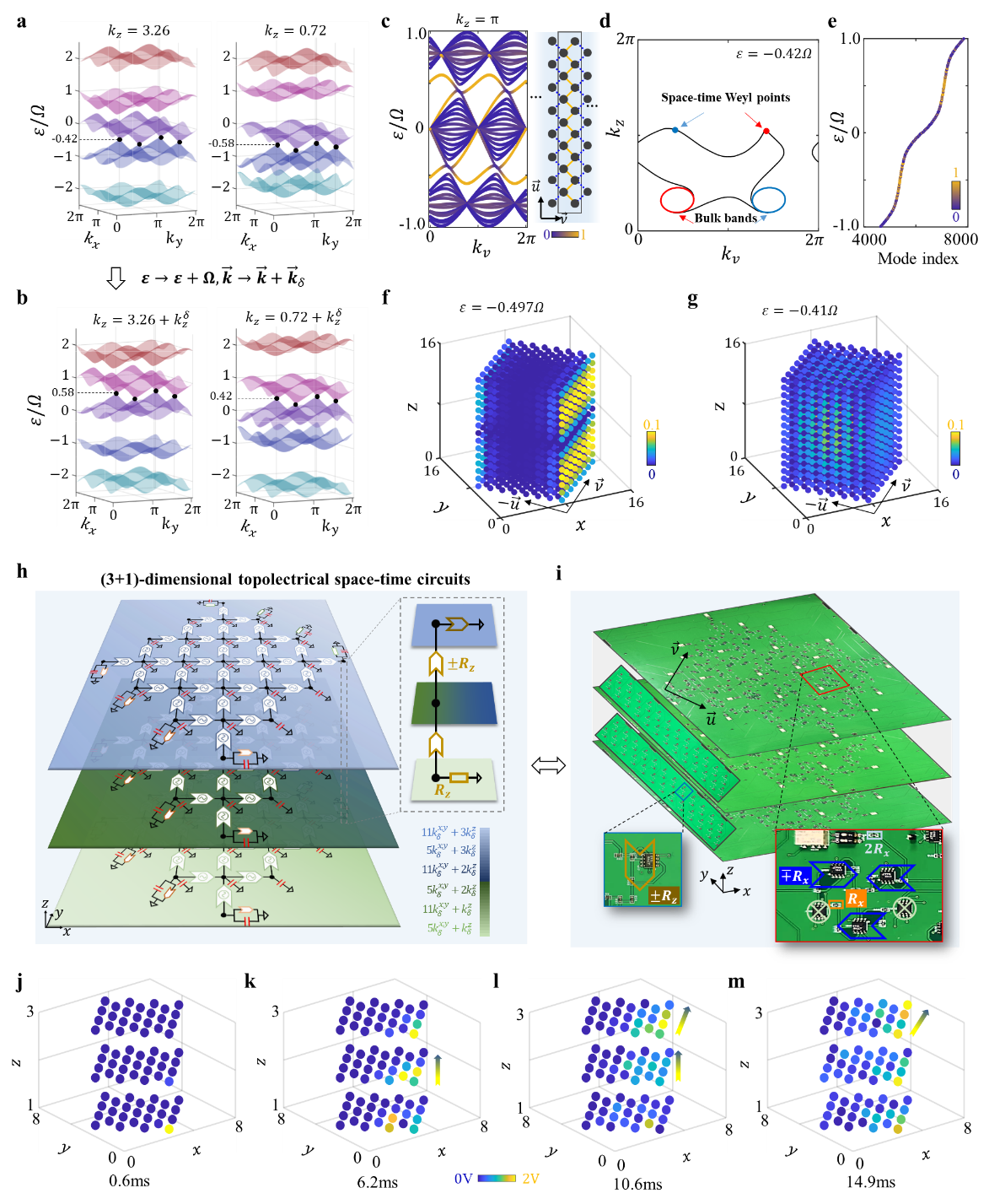 。空时Weyl点的存在还可以在开边界结构中诱导表面状态出现(图3c)。这些表面态可以形成Fermi-arc,如图3d所示。图3e展示了开边界条件下,(3+1)维拓扑空时晶体的准特能谱。图3f-3g绘制了ε = -0.497Ω的Weyl表面态和ε = -0.41Ω的体态的空间分布。最后,研究人员设计并制备了(3+1)维拓扑空时电路(图3h-i),实现了对上述空时Weyl表面态的实验观测(图3j-3m)。