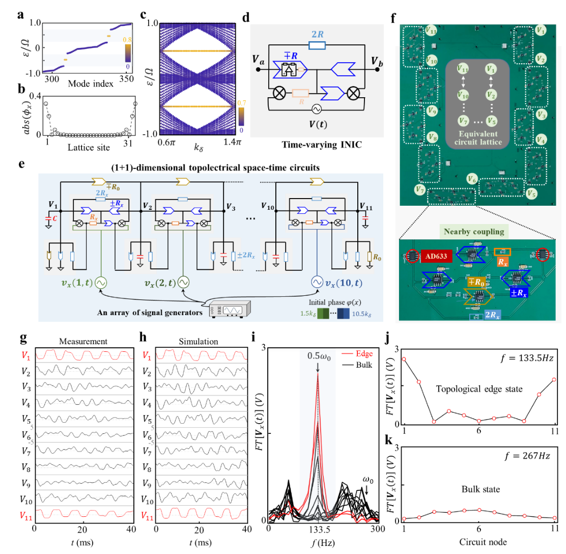 进一步,研究人员设计并制备了(1+1)维拓扑空时电路,实现了对上述拓扑边界态的实验观测。为了实现电路耦合的空时调制,他们设计了一种由外加信号控制的时变非互易电阻(图1d)。通过调节不同电路节点之间控制信号的相位和频率,可以构造出具有(1+1)维空时平移对称性的电路网络(图1e)。实验样品的实物照片及细节放大图显示在图1f中。研究人员测量了电路网络的电压动力学,并将其与理论仿真结果进行了对比(图1g-h)。测量结果与仿真高度一致,傅里叶变换得到的频谱在133.5Hz处显示出拓扑边界态的特征频率(图1i)。当频率为133.5Hz时,傅里叶变换下的电压分布呈现出强烈的边界局域性(图1k);相比之下,体态频率267Hz下的电压分布则表现为空间扩展分布(图1j)。这些结果清晰地证明,通过拓扑空时电路成功实现了(1+1)维拓扑空时边界态。