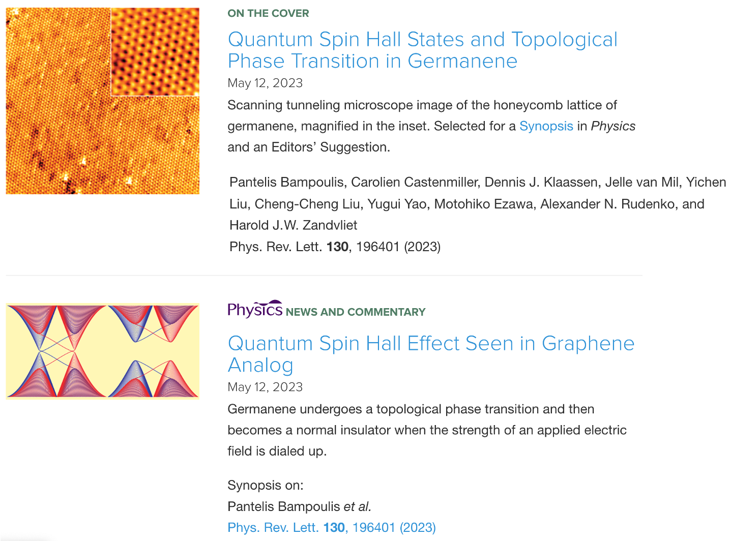 44118太阳成城集团刘一辰博士生、刘铖铖教授和姚裕贵教授与合作者,包括荷兰特文特大学Pantelis Bampoulis、Harold J. W. Zandvliet教授及日本东京大学Motohiko Ezawa教授,实验观测到了锗烯中的量子自旋霍尔态及拓扑相变。该成果5月12日发表在国际知名期刊《物理评论快报》上,并被选为该期的封面文章(Cover)和编辑推荐(Editors' Suggestion),同时也被美国物理学会Physics网站专题评论报道。该工作证实了姚裕贵团队12年前的理论预言【Quantum Spin Hall Effect in Silicene and Two-Dimensional Germanium, Cheng-Cheng Liu, Wanxiang Feng and Yugui Yao, Phys. Rev. Lett. 107, 076802 (2011) SCI引用1894次;Low-energy effective Hamiltonian involving spin-orbit coupling in silicene and two-dimensional germanium and tin, Cheng-Cheng Liu, Hua Jiang and Yugui Yao, Phys. Rev. B 84, 195430 (2011) SCI引用988次】。