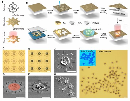 图2:纳米剪纸微型转子的制备、释放和转移。(A)纳米剪纸微型转子的制造流程图;(b)微型转子的实验制备、释放和转移示意图;(C-F)制备的微型转子光学显微镜和SEM图像;(G-I)释放和转移后的微型转子SEM图像和光学显微镜图片。比例尺:(C-H):5 µm,(I):10 µm。