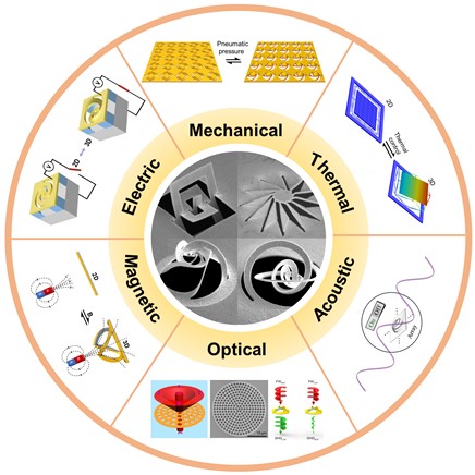图5:纳米剪纸结构的多物理场协同调控研究(Nano-kirigami/origami fabrications and optical applications, Appl. Phys. Lett. 124, 160501 (2024), Front Cover, doi: 10.1063/5.0199052)。