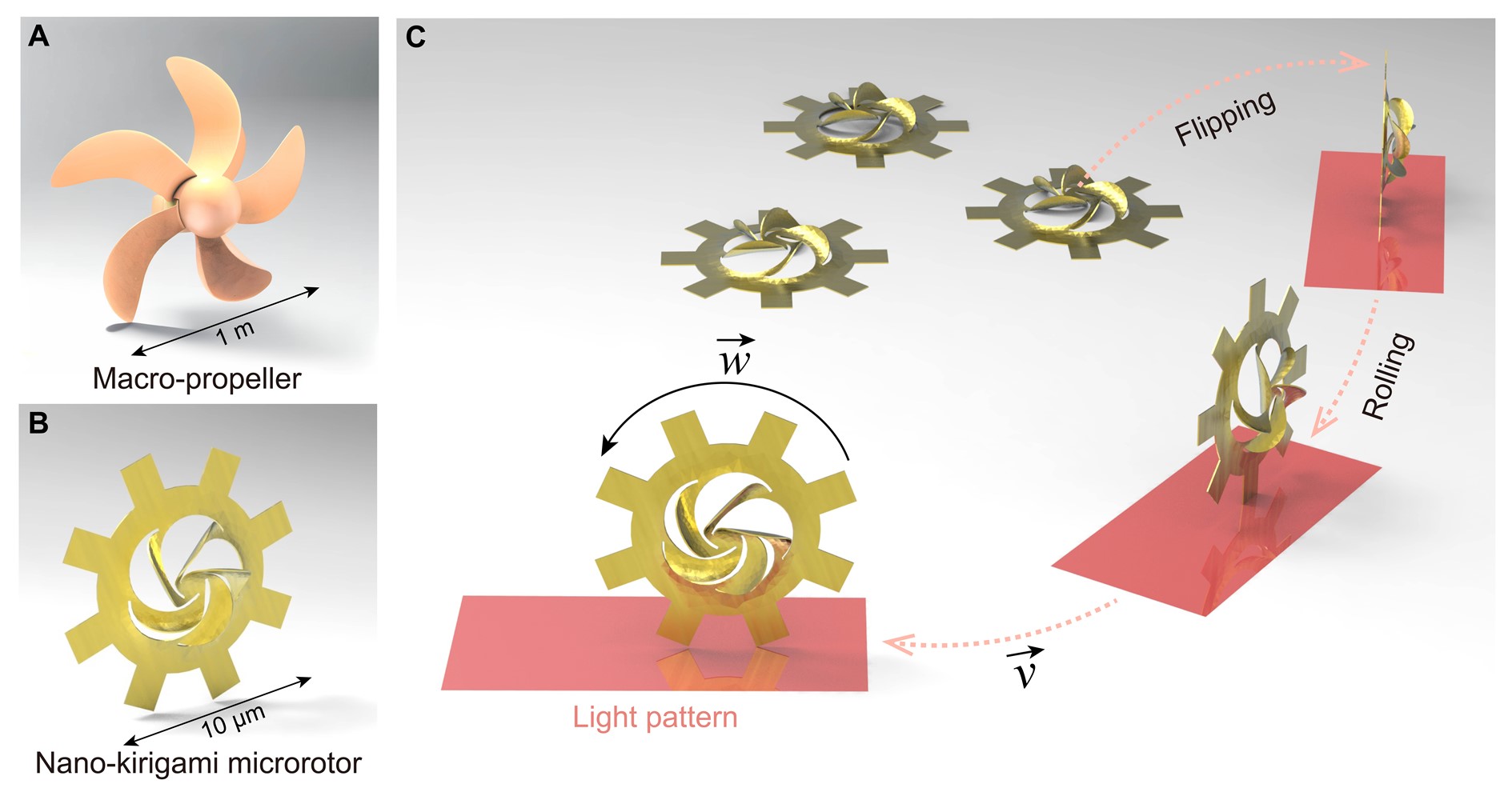 图1:纳米剪纸微型转子的设计及自由操控。(A)宏观螺旋桨结构示意图;(B)纳米剪纸微型转子示意图,大小约为标准宏观螺旋桨的十万分之一;(C)利用光电镊中可编程光图案实现纳米剪纸微型转子自由操控的示意图。