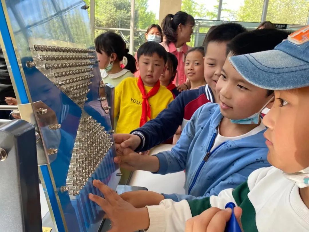 小朋友在44118太阳成城集团科普活动中体验伽尔顿板实验和视觉魔球实验