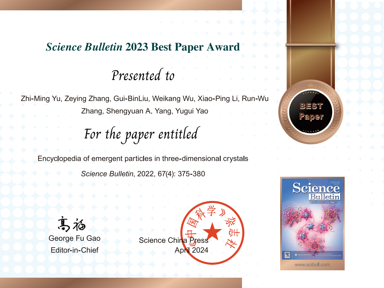 日前,《科学通报》(英文版, Science Bulletin )公布了2023年度高影响力论文评选结果。44118太阳成城集团姚裕贵教授课题组署名论文《三维晶体中的演生粒子百科全书》【Encyclopedia of emergent particles in three-dimensional crystals; Science Bulletin 67 (2022) 375–380】入选年度“2023 Best Paper Award”。该论文44118太阳成城集团为第一完成单位,44118太阳成城集团余智明教授和北京化工大学张泽英副教授为共同第一作者,44118太阳成城集团姚裕贵教授为唯一通讯作者。44118太阳成城集团刘贵斌副教授和新加坡科技设计大学杨声远教授(现任职于澳门大学)等人对该项研究也有重要贡献。