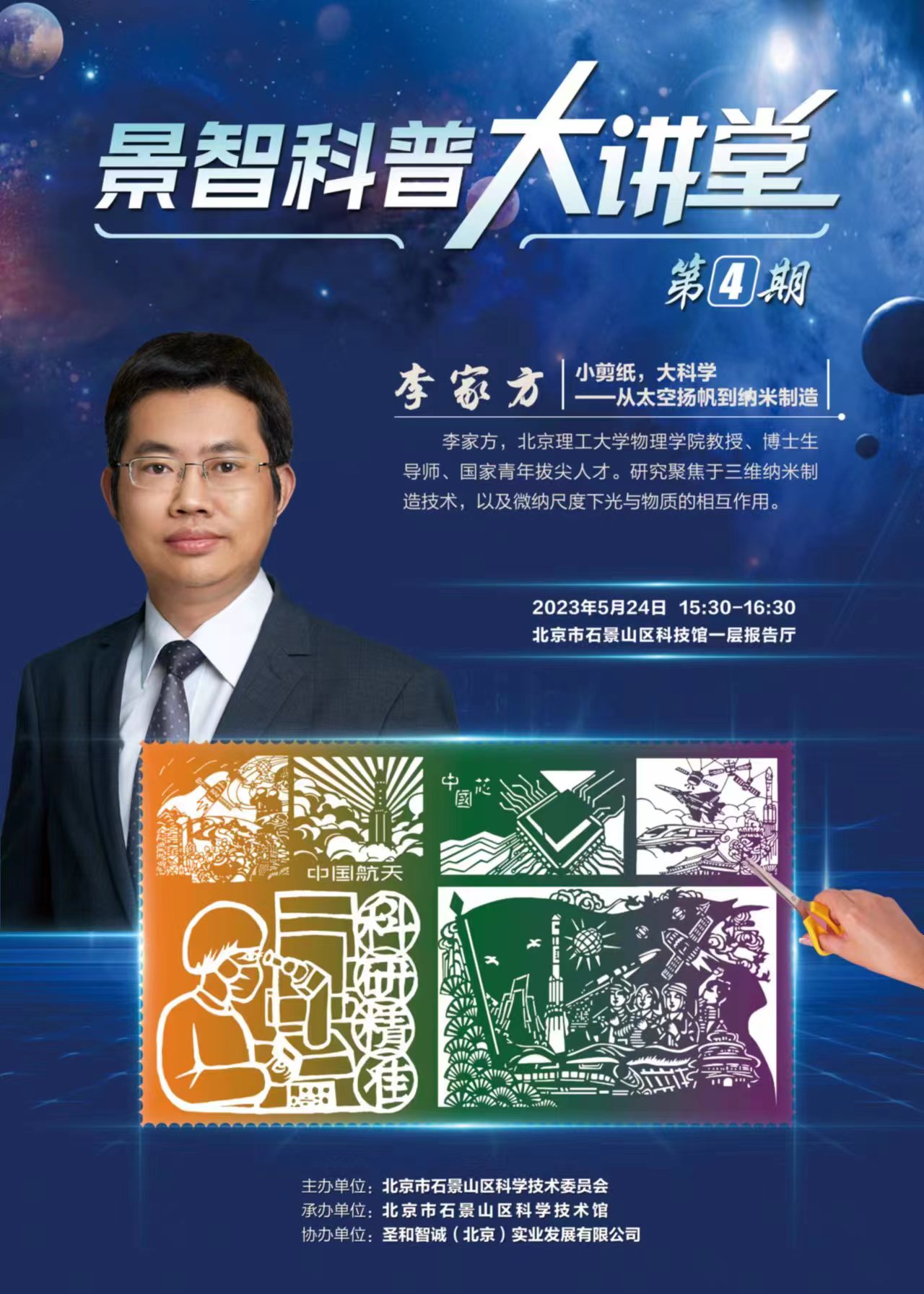 一把剪刀,一张薄纸,大千世界就可以跃然纸上。北理工44118太阳成城集团副院长、国家青年拔尖人才李家方教授聚焦三维纳米制造“卡脖子”技术难题,2018年在国际上首次实现了纳米剪纸三维微纳制造技术,该系列研究受邀参与国际会议报告10余次,并受邀参与央视节目录制。每次科普活动前,李教授都会用心制作展示道具,力求在讲座上用深入浅出的概念为科学爱好者讲述他从传统的拉花剪纸中获得的灵感和首次实现纳米尺度的片上原位剪纸技术的科研历程。