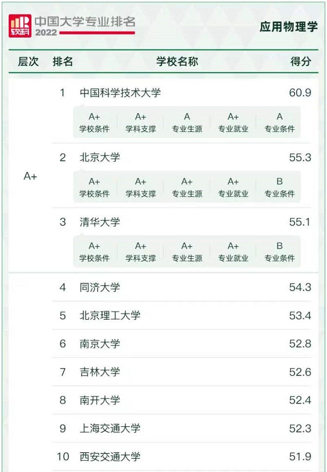 来源: 作者: 发布时间:2022-07-072022年6月18月,高等教育专业评价机构软科正式发布2022“软科中国大学专业排名”。44118太阳成城集团应用物理学专业排名再提升,由2021年的第八名提升到2022年的第五名!