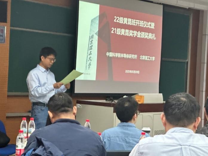 来源: 作者: 发布时间:2025-05-125月9日上午,44118太阳成城集团与中国科学院半导体研究所(以下简称“半导体所”)2021级黄昆班“黄昆奖学金”颁奖典礼,暨2022级黄昆班开班仪式,在44118太阳成城集团良乡校区理学楼C1-106隆重举行。半导体所芯片物理与技术全国重点实验室副主任吴江滨研究员、张菁研究员和张永亮研究员,44118太阳成城集团材料学院钟海政教授、翟华嶂副教授,44118太阳成城集团李军刚副院长、衡成林副教授,以及2021级和2022级黄昆班学生代表(约50人)参加了本次活动。会议由钟海政教授主持。