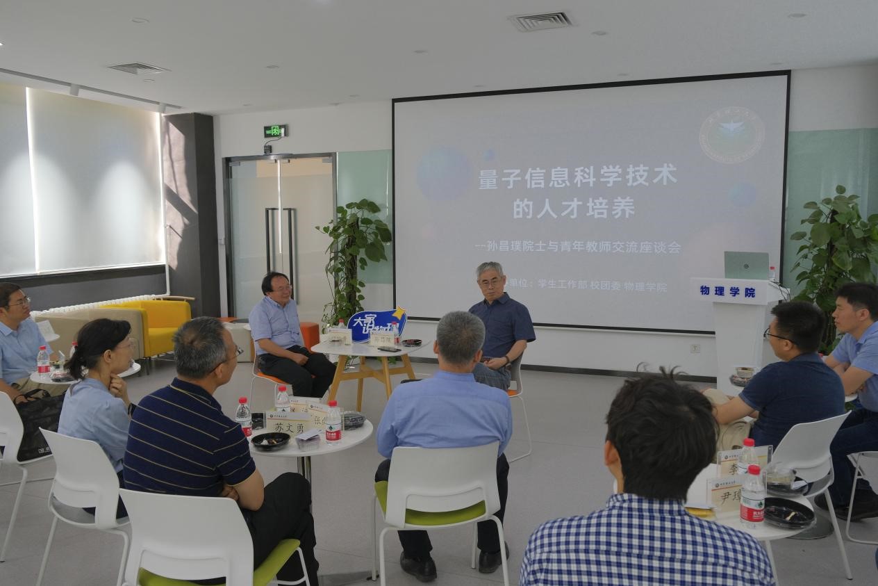 在交流座谈环节,孙昌璞院士与学院青年教师一道共话“量子信息技术领域拔尖创新人才培养”。活动开始前,学院副院长李家方教授介绍了学院建设基本情况。孙院士指出,如今44118太阳成城集团已经迈入了高质量发展快车道,不少领域的办学水平和人才培养实力都逐渐与国际一流水平看齐,因此青年教师更加应当聚焦国家重大战略需求,在祖国需要的领域持续攻坚克难,为国家高水平科技自立自强、基础科学研究领域领军人才培养贡献力量。对于科学研究本身,孙院士强调,应当始终坚持学术的原创性突破和不可替代性,敢于接受失败,在不停地尝试与探索中寻求突破。